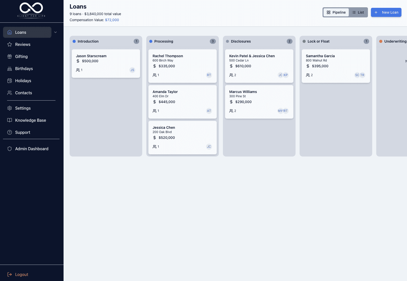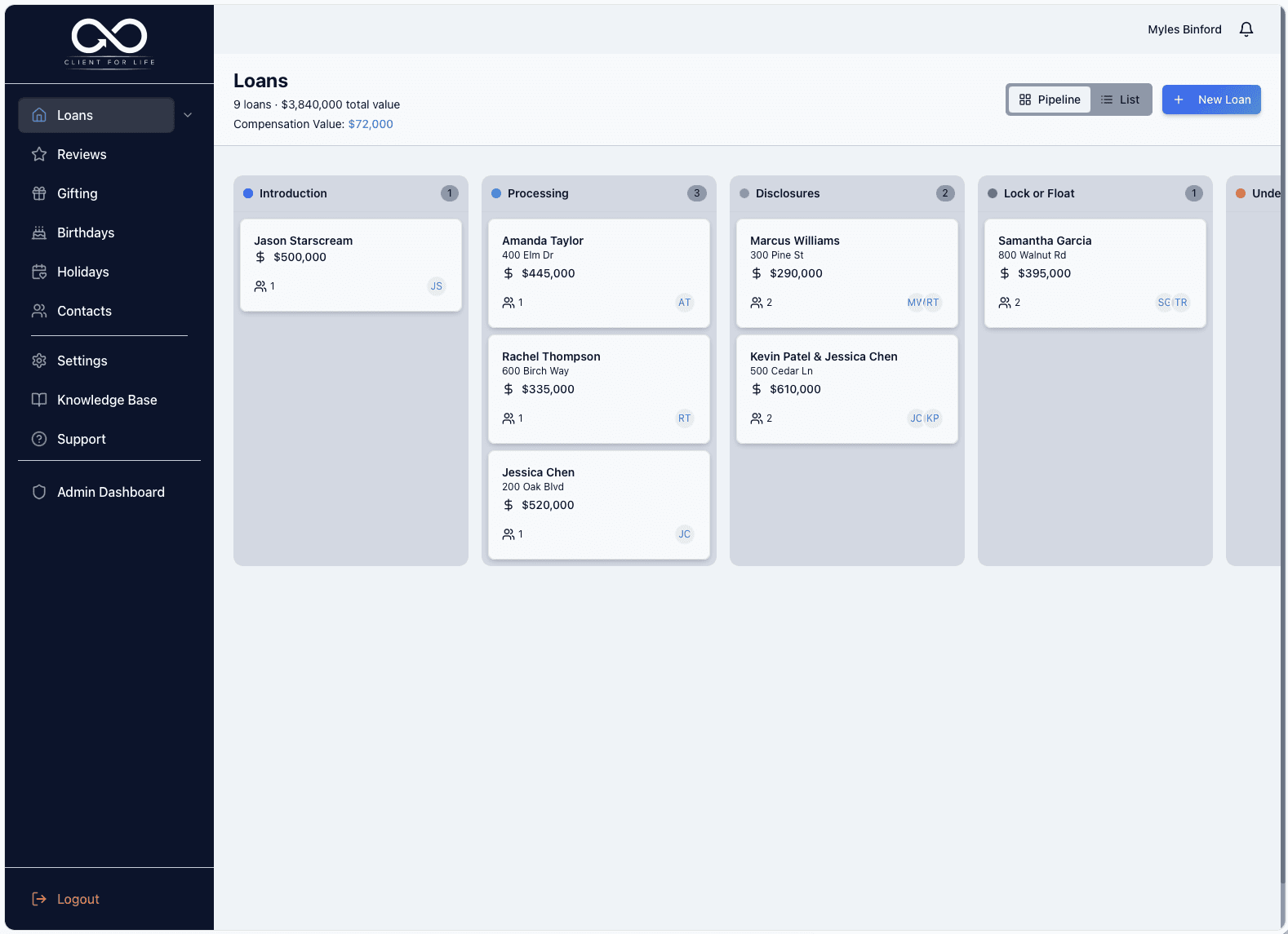 Founded by a top producing Mortgage Broker who searched for and tested most of the best CRMs looking for a solution beyond lead conversion that would take care of customer service and not just front end lead generation. Here's what he says, "Take a look, CRMs in the mortgage space are focused primarily on lead generation and tracking but omit what happens after you go into contract. The point is, the better customer service you give, the more a client is going to come back to you, the more they are going to refer others to you. This is the easiest source for repeat business. So, I built Client for Life, not to change what you are doing, but to amplify it and create clients for life."