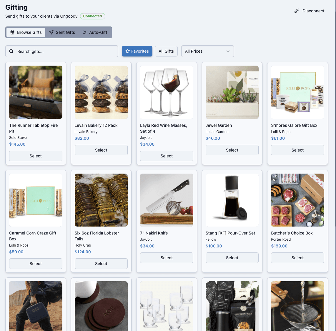 Automatically send pre-chosen gifts to clients after closing. If they want something else, they can change the gift and address. You simply set the budget and let us do the rest.